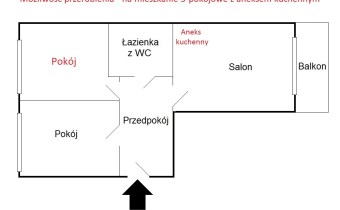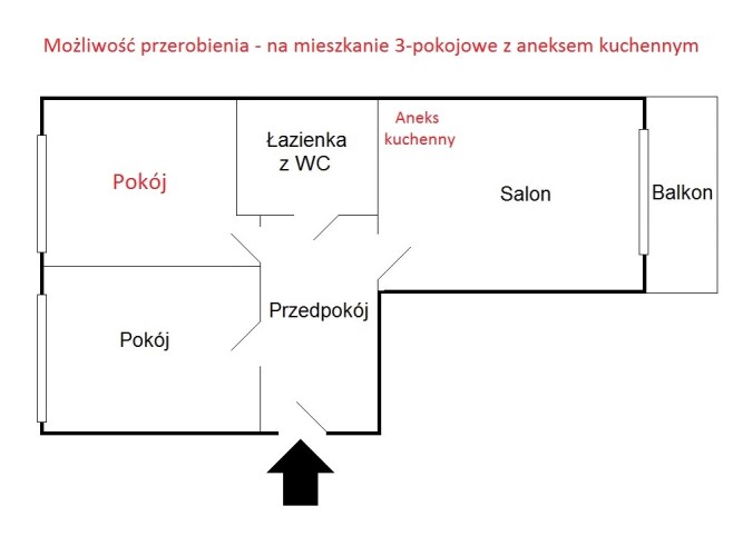 Po niewielkiej modyfikacji mieszkania - można uzyskać 3 pokoje z aneksem kuchennym (widoczne na planie).