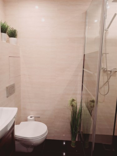Kuchnia, łazienka z wc i przedpokój – na podłodze gres.