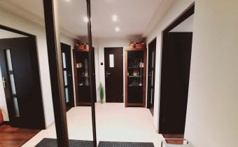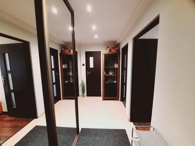 Mieszkanie jest w bardzo dobrym stanie technicznym – wysoki standard, środkowe i dwustronne. Wnętrze wykończone zostało dobrymi materiałami wysokiej jakości. W salonie, kuchni, dwóch sypialniach, przedpokoju i łazience z wc - podwieszane sufity z halogenami.