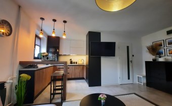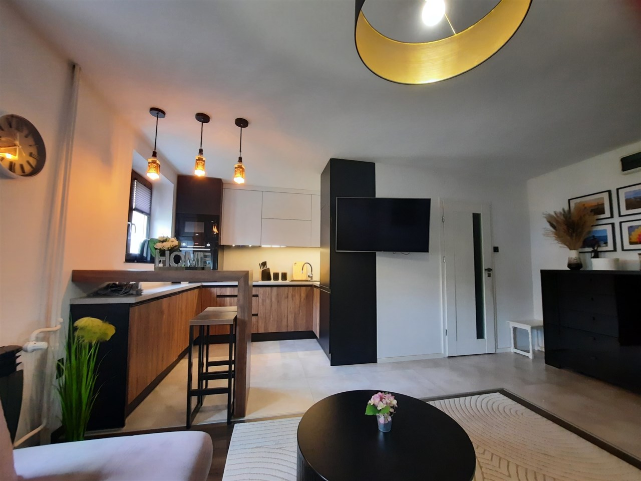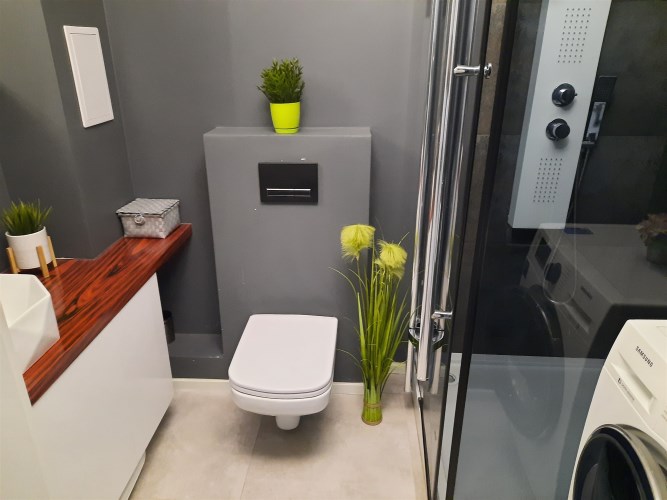 W cenie mieszkania zostają zabudowy stałe, nowe meble oraz sprzęt AGD i RTV: lodówka, zmywarka, pralka, telewizor, piekarnik, pochłaniacz, mikrofalówka, wielofunkcyjna kabina prysznicowa z hydromasażem, oraz płyta indukcyjna (wszystko widoczne na zdjęciach).