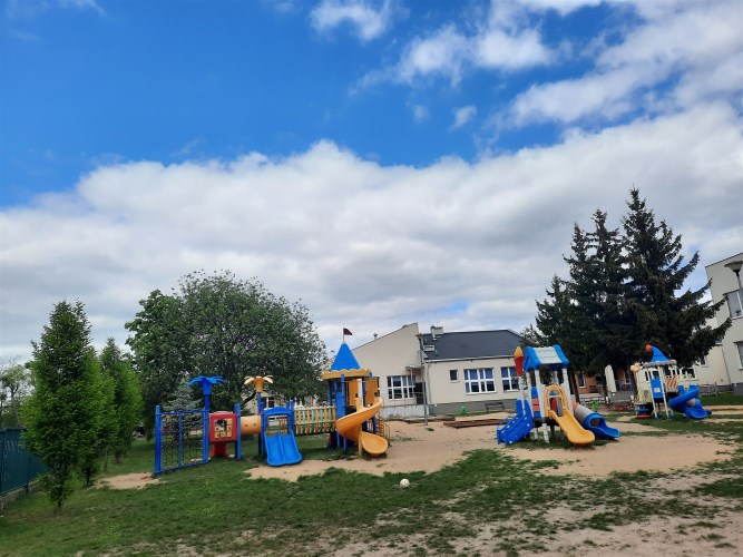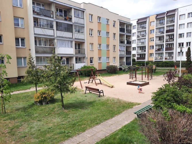 Przed budynkiem znajduje się dziedziniec z placem zabaw.