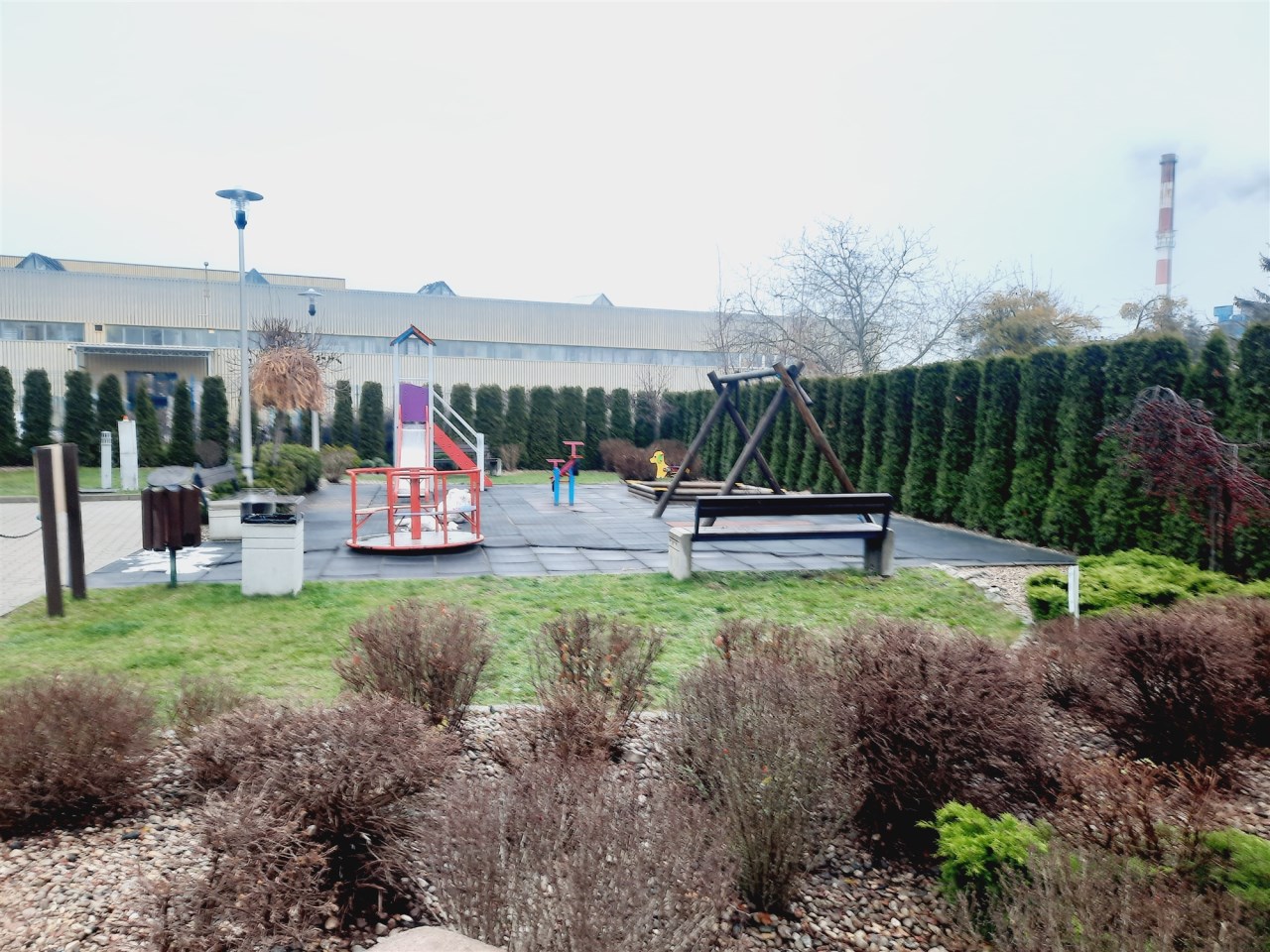 Przed budynkiem znajduje się dziedziniec z placem zabaw.