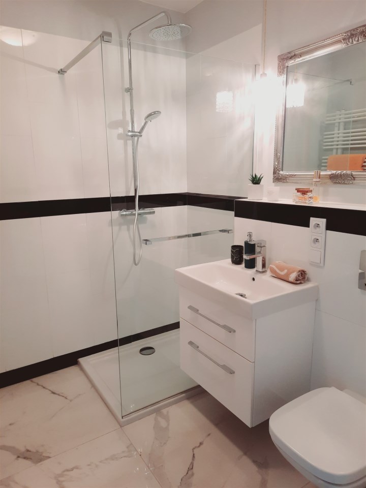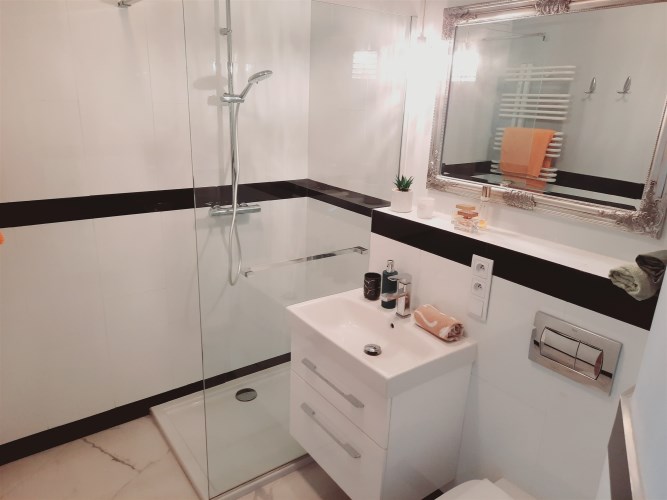 Mieszkanie jest w bardzo dobrym stanie technicznym – wysoki standard, środkowe i dwustronne. Wnętrze wykończone zostało drogimi materiałami wysokiej jakości. W kuchni, jadalni i w łazience z wc - podwieszany sufit z halogenami.