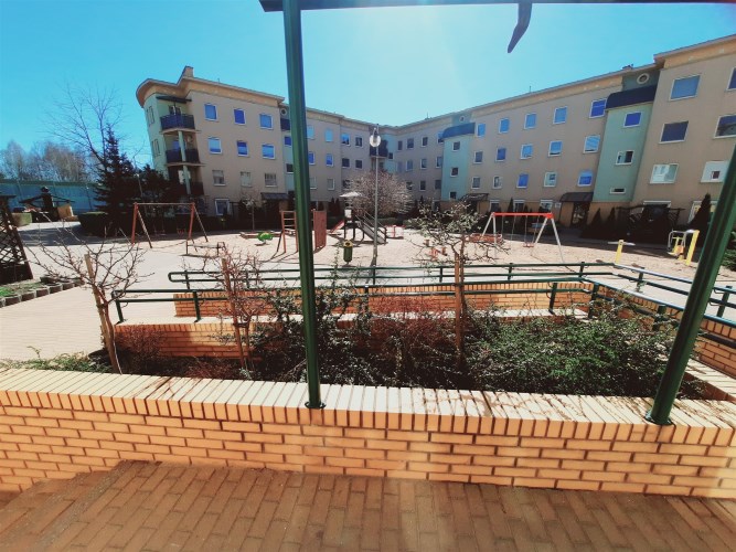 Przed budynkiem znajduje się dziedziniec z placem zabaw.