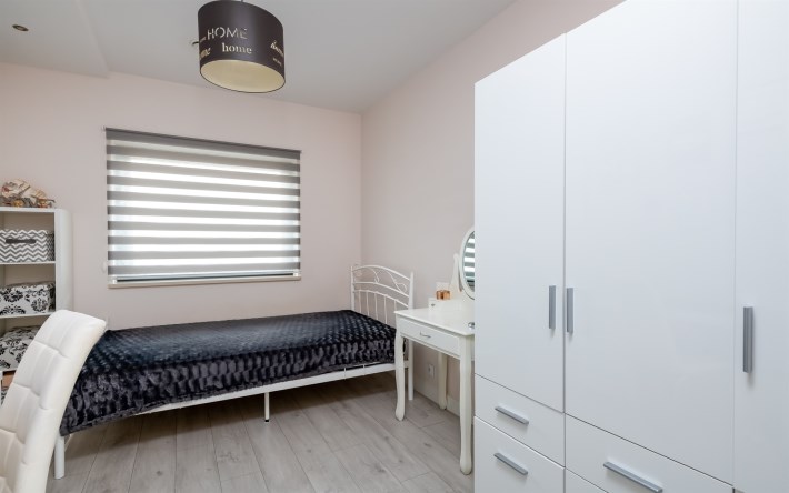 Dom z wieloma udogodnieniami. Bogate i nowocześnie wykończone wnętrze. Kuchnia wykonana na zamówienie od stolarza, blaty kuchenne wykonane ze spieków kwarcowych. Pełne AGD wliczone w cenę nieruchomości (Boch i Samsung). Przestronny salon z zabudową RTV. W części centralnej domu klimatyzacja Hisense. Przemyślany rozkład pomieszczeń wraz z pomocniczymi częściami takimi jak garderoba w głównej sypialni czy pralnia z suszarnią.