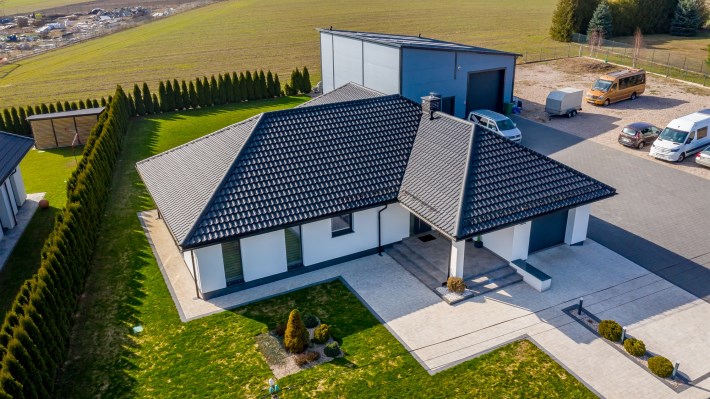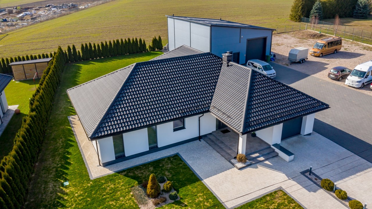 - Dach kryty blachodachówką modułową Venecja w kolorze antracytu.