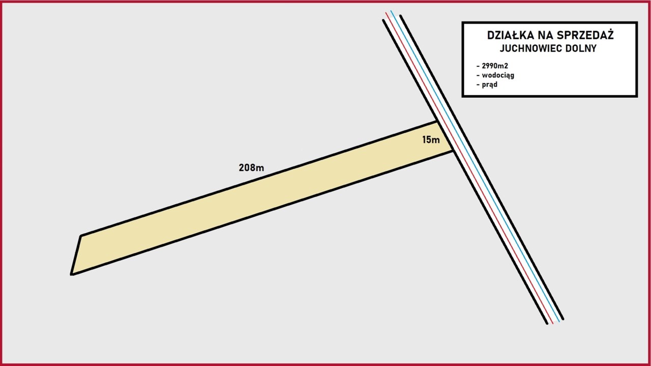 15 x 208m, sąsiaduje z działkami na których niedawno powstały nowe domy.