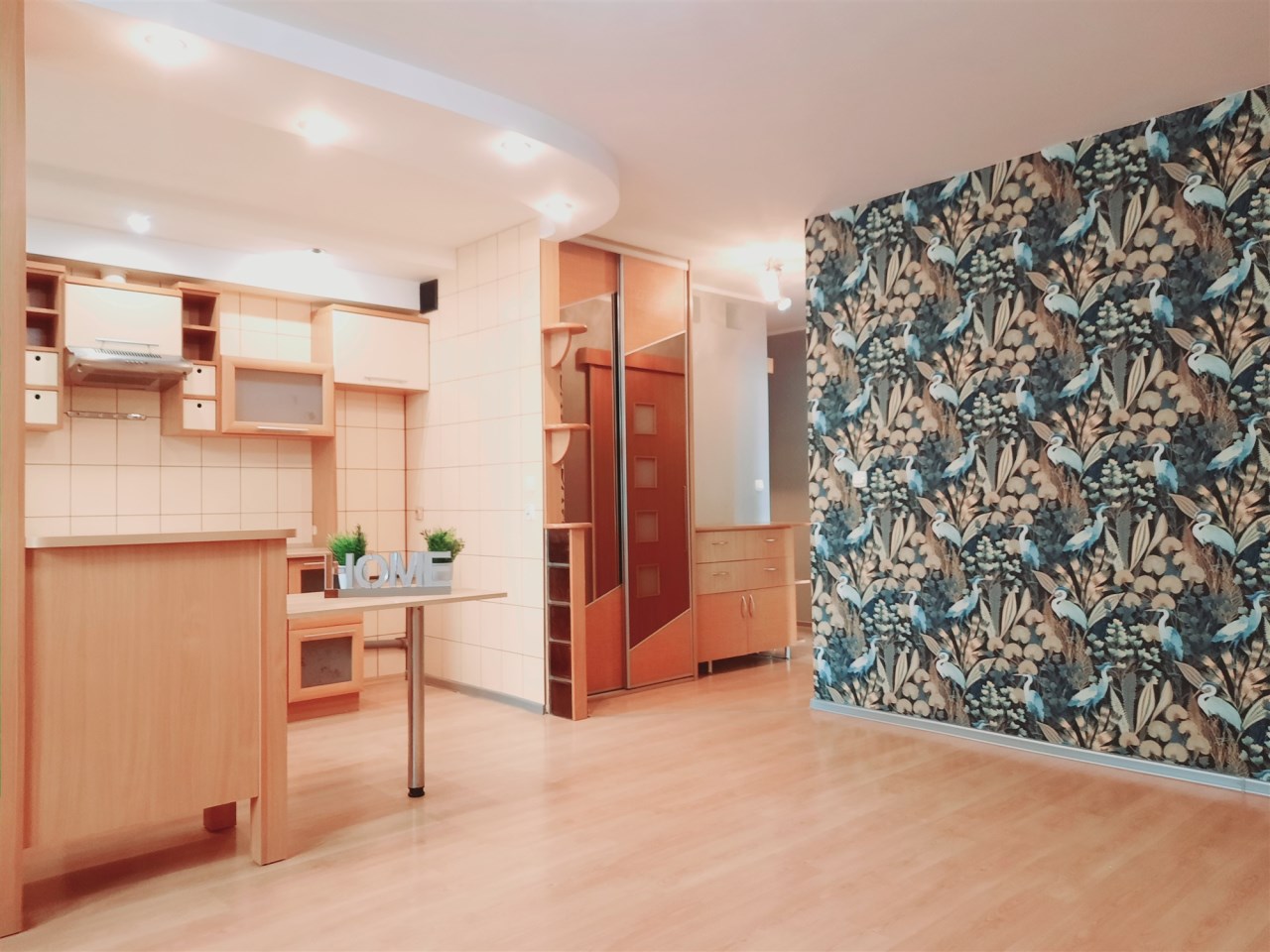 Aneks kuchenny i łazienka z wc – podwieszany sufit z halogenami. Na podłodze gres w łazience a w aneksie kuchennym na podłodze panele.