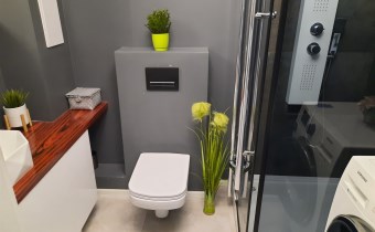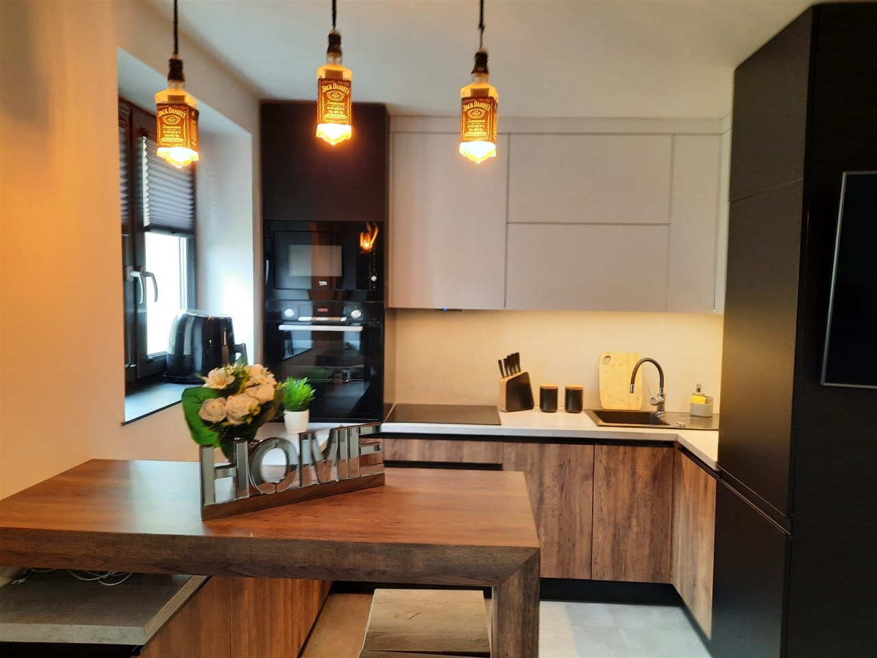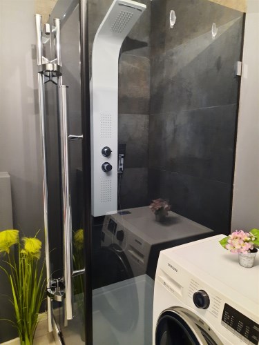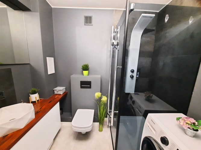 W cenie mieszkania zostają zabudowy stałe, nowe meble oraz sprzęt AGD i RTV: lodówka, zmywarka, pralka, telewizor, piekarnik, pochłaniacz, mikrofalówka, wielofunkcyjna kabina prysznicowa z hydromasażem, oraz płyta indukcyjna (wszystko widoczne na zdjęciach).