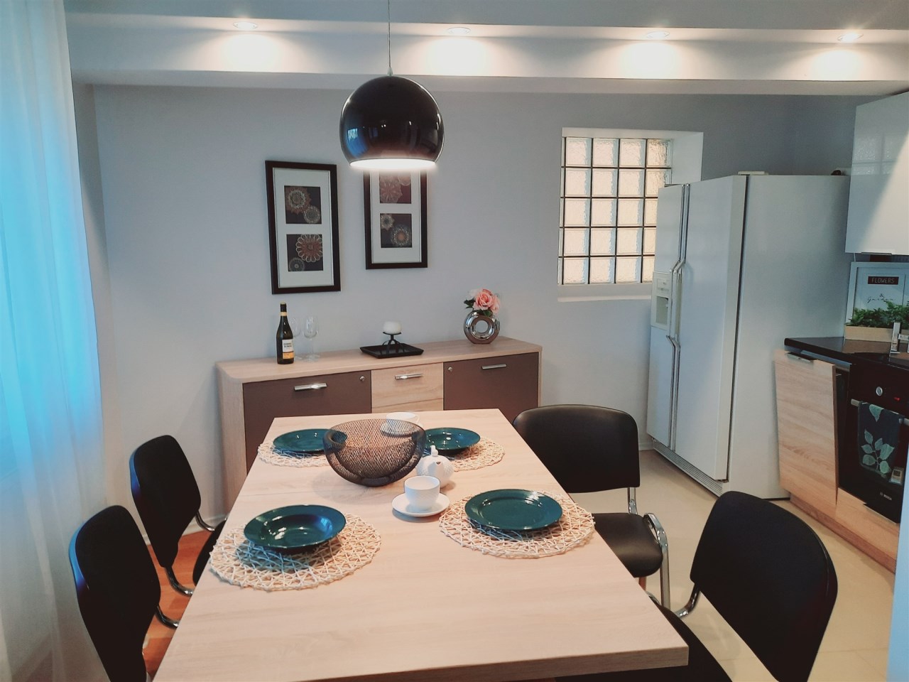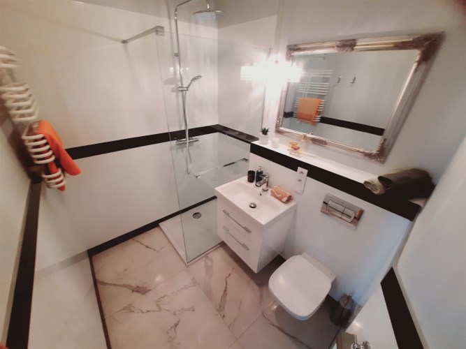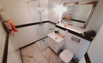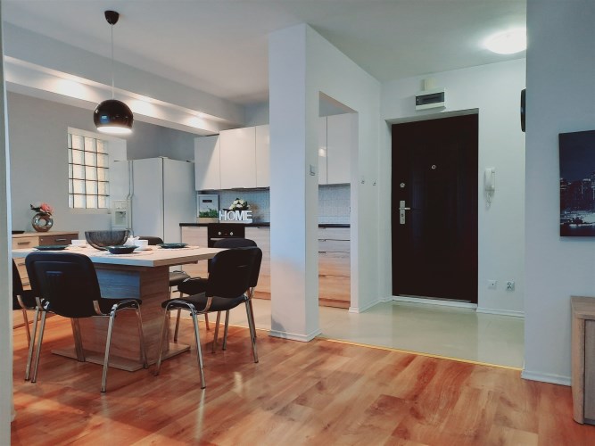 Mieszkanie jest w bardzo dobrym stanie technicznym – wysoki standard, środkowe i dwustronne. Wnętrze wykończone zostało drogimi materiałami wysokiej jakości. W kuchni, jadalni i w łazience z wc - podwieszany sufit z halogenami.