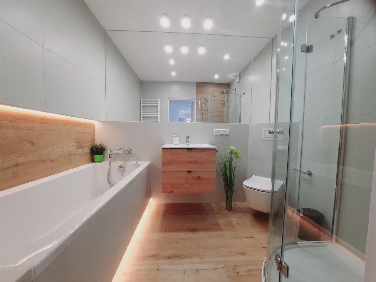 Apartament jest w bardzo dobrym stanie technicznym – wysoki standard, dwustronny. Wnętrze wykończone zostało drogimi materiałami wysokiej jakości. W łazience z wc - podwieszany sufit z halogenami.