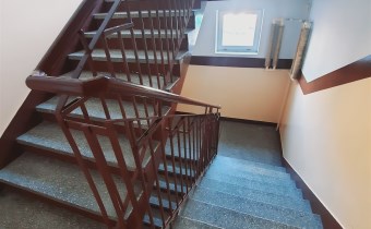 Przestronna, czysta i zadbana klatka schodowa.
